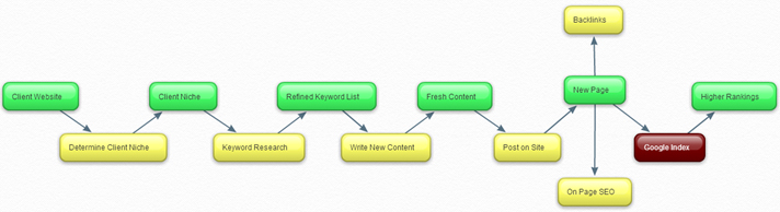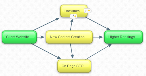 Here’s a simplified process diagram of an SEO business. Inputs are in green and processes are in yellow: